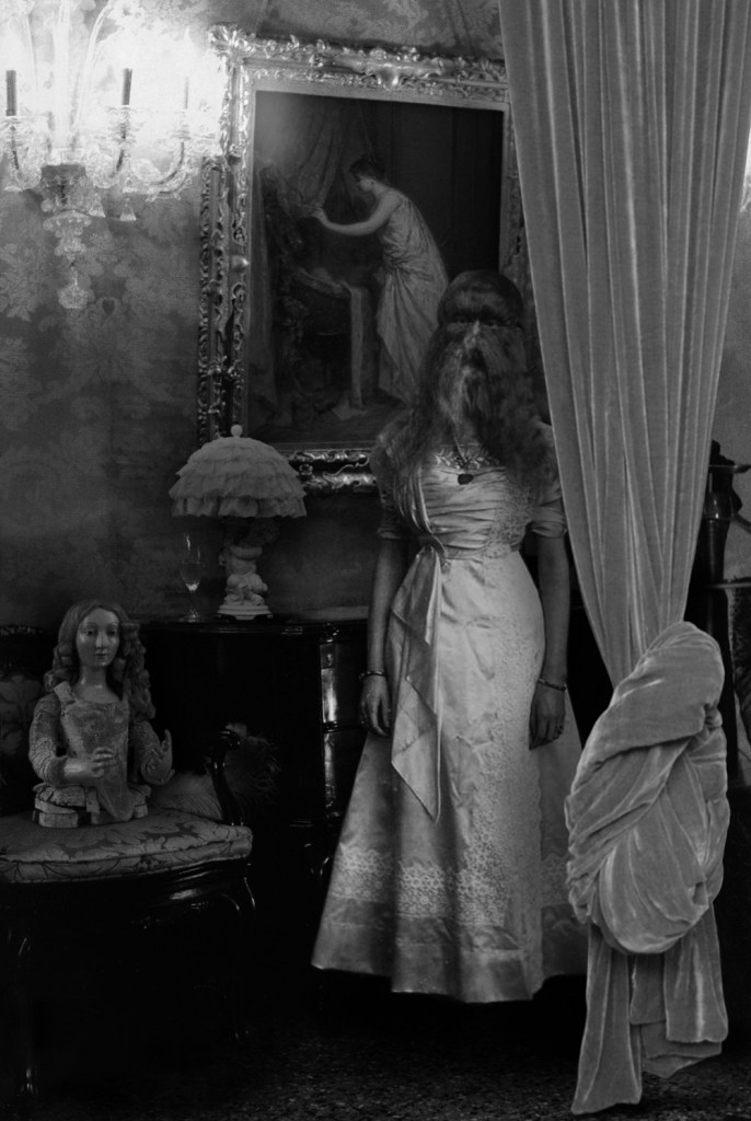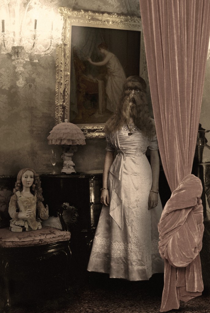 Les Spectaculaires is one of the most disturbing series of Womankind. It portrays ten women who were affected by some type of «abnormality.» Women with an exceptional physical condition that made them unique, such as lacking arms or legs, being extremely short or tall, faces covered with hair, or the conjoined bodies of Siamese twins. The original photographs, with which the artist has worked, are from the late 19th and early 20th century, when these women worked in side shows associated with circus and were exhibited as human oddities.